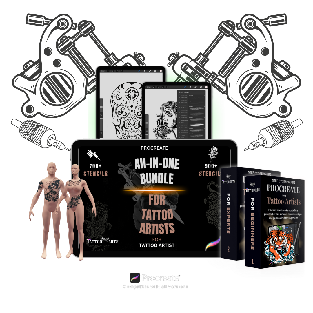 A: You'll need to purchase the Procreate app separately from the App Store (it's a one-time payment of around $12.99). Our TattooArts Bundle contains all the premium tools that work INSIDE Procreate—700+ brushes, 900+ stencils, 3D models, textures, and guides. Think of Procreate as the canvas, and our bundle as your complete professional toolkit.